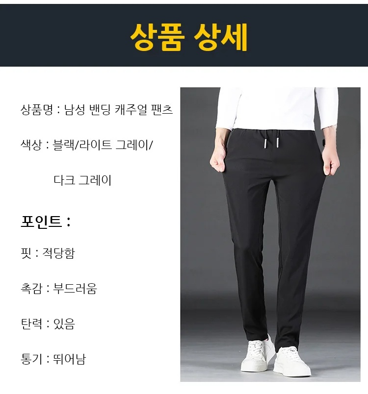 ● 허리 밴딩 디자인으로 장시간 착용에도 편안함을 제공하며, 활동성이 뛰어나 데일리룩으로 적합합니다. ● 고급스러운 소재와 깔끔한 핏으로 다양한 상의와 손쉽게 매치되어 세련된 스타일을 완성할 수 있습니다. ● 구김이 적고 관리가 쉬운 원단을 사용하여 바쁜 일상에서도 실용적이며 오래도록 새 옷처럼 착용할 수 있습니다. ● 캐주얼부터 비즈니스 캐주얼까지 폭넓게 활용 가능하며, 남성의 다양한 라이프스타일에 완벽하게 어울립니다. ● 계절에 상관없이 입기 좋은 두께감과 통기성으로 사계절 내내 쾌적한 착용감을 선사합니다.