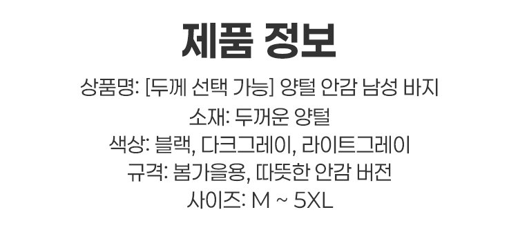 ● 두께 선택이 가능하여 계절과 취향에 맞게 착용할 수 있어 더욱 실용적인 남성 양털 안감 바지입니다. ● 부드럽고 포근한 양털 안감으로 한겨울에도 따뜻하게 착용 가능하며, 보온성이 뛰어나 장시간 외출에도 걱정 없습니다. ● 세련된 디자인과 편안한 핏으로 일상복, 외출복, 실내복 등 다양한 상황에 스타일리시하게 활용할 수 있습니다. ● 고급 소재 사용으로 내구성이 우수하며, 활동성이 좋아 일상 생활은 물론 야외활동에도 적합한 제품입니다.